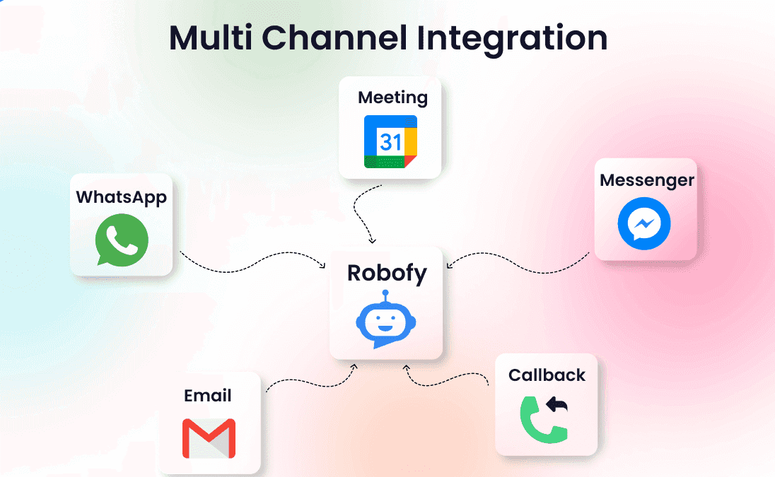 - Multi channel integration: Seamlessly integrate WhatsApp, FB Messenger, Gmail, Zoom, Google Meet and much more with Robofy.